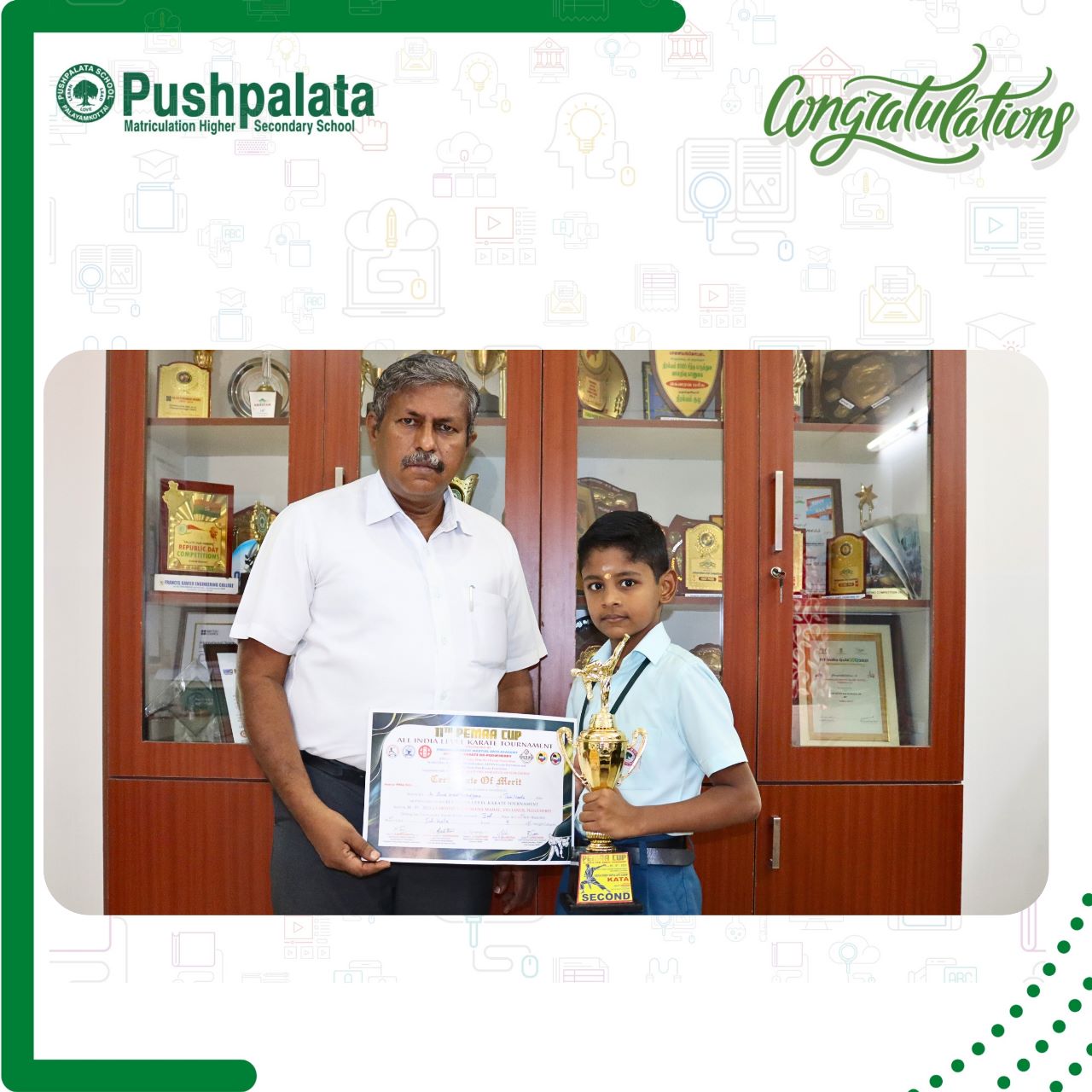 The 11th Pemaa Cup, an All India Karate Tournament organized by Pudhuvai Everest Martial Arts Academy was held at Pudhucherry on 30th July 2023. We are glad to inform you that K Siva Karthikeyan of Class IV secured the 2nd place in the Boys Ind-Kata event for the Under-9 age category.