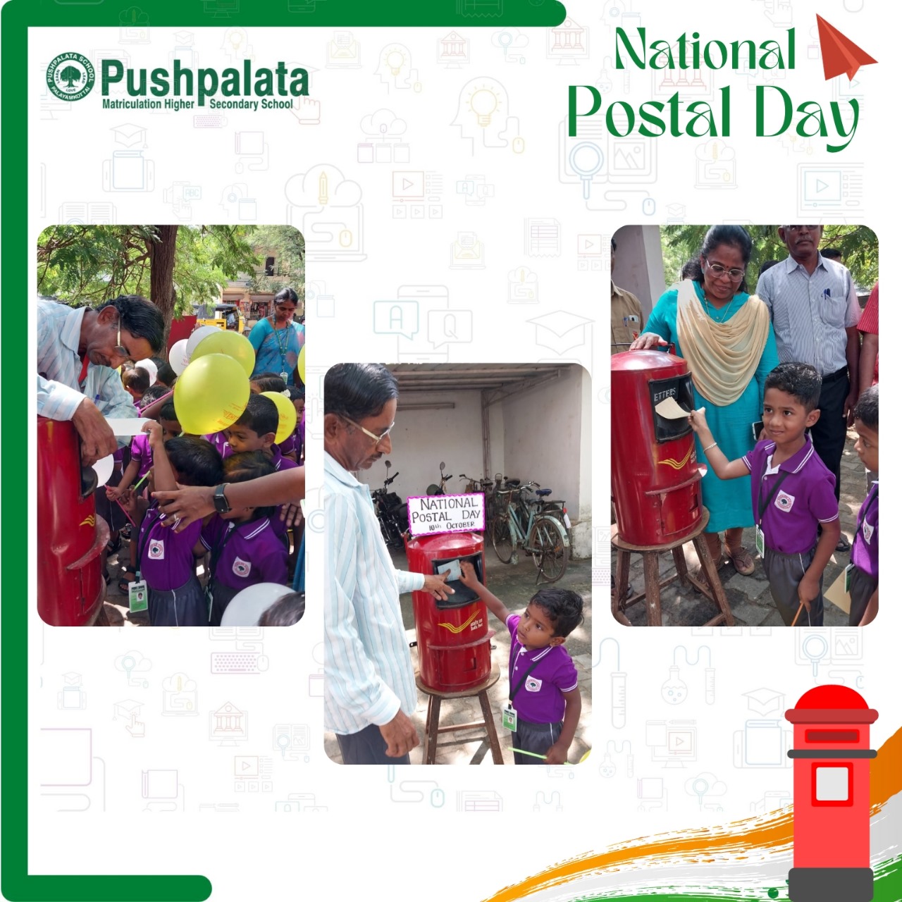 National Postal Day is celebrated each year on 10th October. Post offices play a crucial role in fostering cohesive, inclusive, connected communities. The children of the Kindergarten were taken to Maharajanagar Post Office where they were greeted warmly by the staff. The children dropped the postcards designed by them for their loved ones inside the postbox. The employees gifted all the children with balloons and candies and made them plant a tree sapling in remembrance of their visit to the Post Office. The Children of Class I to V were involved in various activities and learned about the importance of postal services in everyday life.